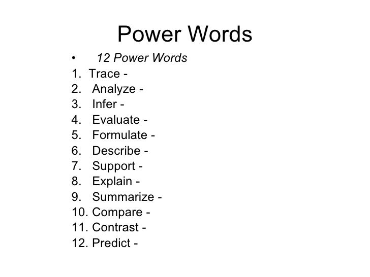 12 Powerful Words WORD STUDENT FRIENDLY PHRASE 1. Trace List in steps 2. Analyze Break apart 3. Infer Read between the lines 4. Evaluate Judge 5. Formulate Create 6. Describe Tell all about, 7. Support Back up with details 8. Explain Tell how 9. Summarize Give me the short version 10.Compare All the ways they are alike 11.